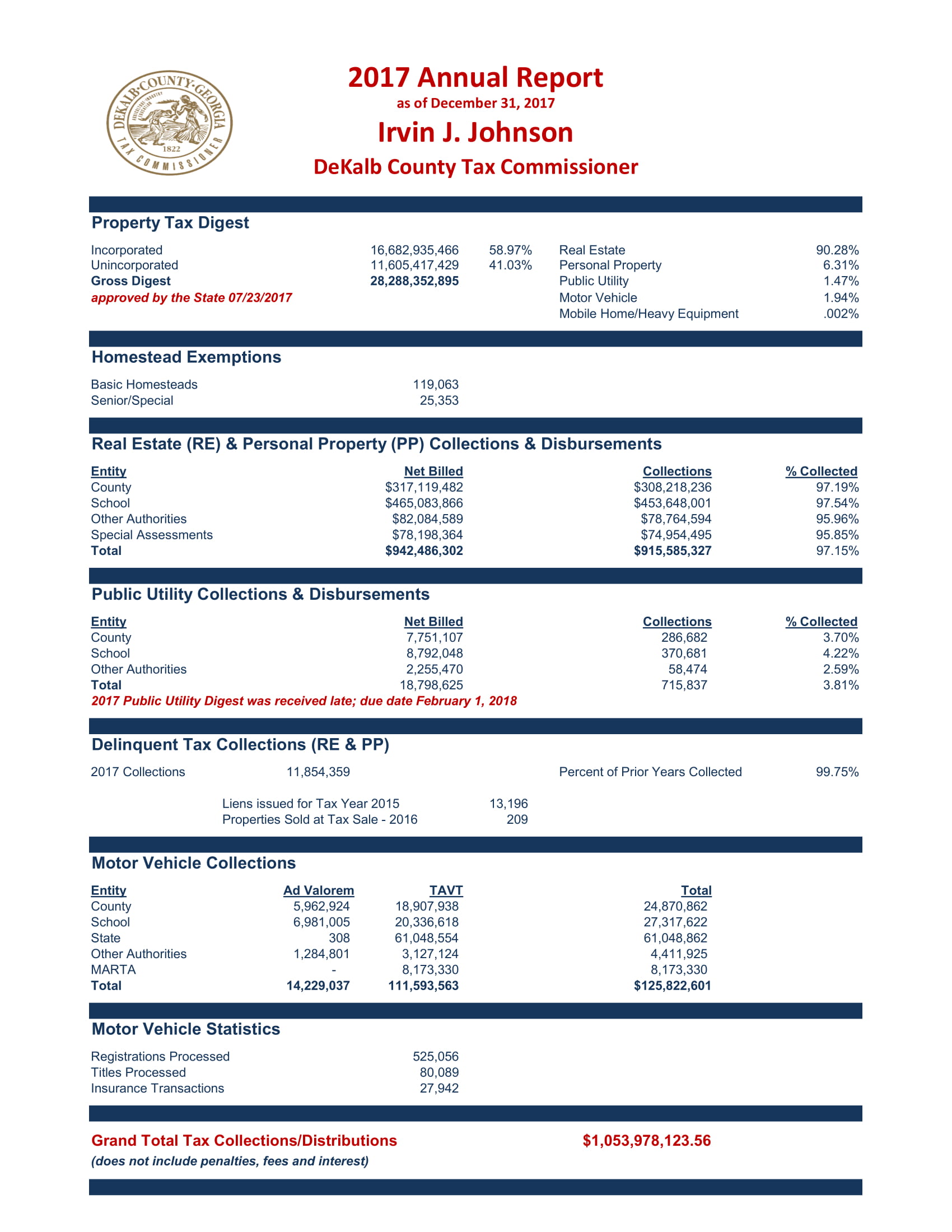 Irvin J. Johnson is a two-term Tax Commissioner of Dekalb County. Mr. Johnson began his career with the tax office in July 2000 as a Network Coordinator. Under the leadership of Tom Scott (deceased) and his successor, Claudia Lawson (retired), Mr. Johnson held several positions within the tax office including supervisor and manager level positions. He was appointed Chief Deputy Tax Commissioner in 2007, succeeded Claudia Lawson as tax commissioner in 2016, and was elected later that year to his first four-year term as the current tax commissioner.